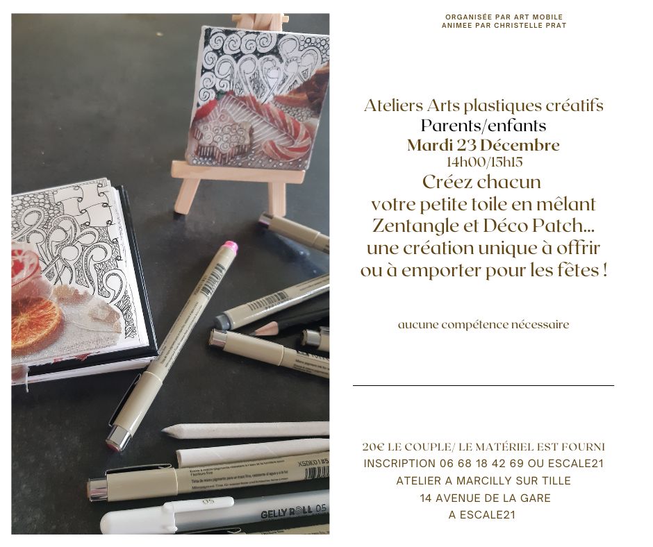 • 23 décembre de 14h à 15h15 : Dessin graphique, inspiré du ”Zentangle”. Aucune compétence nécessaire.